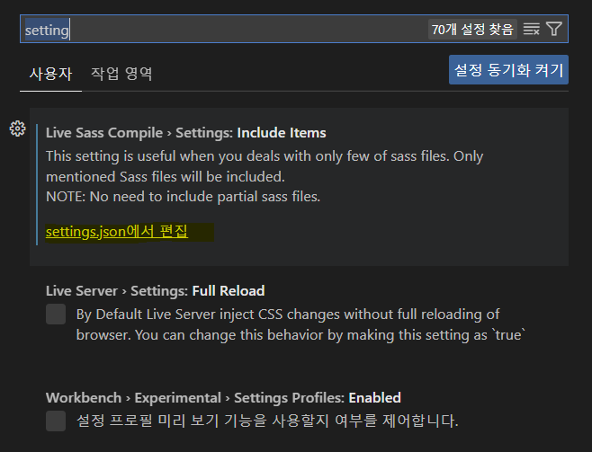 ▶ setting.json에서 편집 클릭(노랑색 표시)