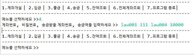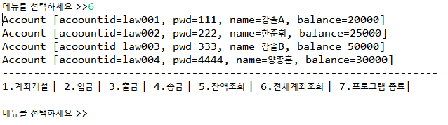 4) ① 계좌 생성 ② 입금 ③ 출금 ④ 송금 ⑤ 잔액 조회 ⑥ 모든 계좌 조회 관련 java문 만들기(Main.java)