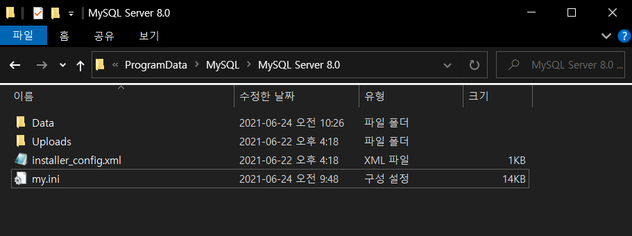 6. MySQL 초기에 다운 받은 my.ini 설정 변경