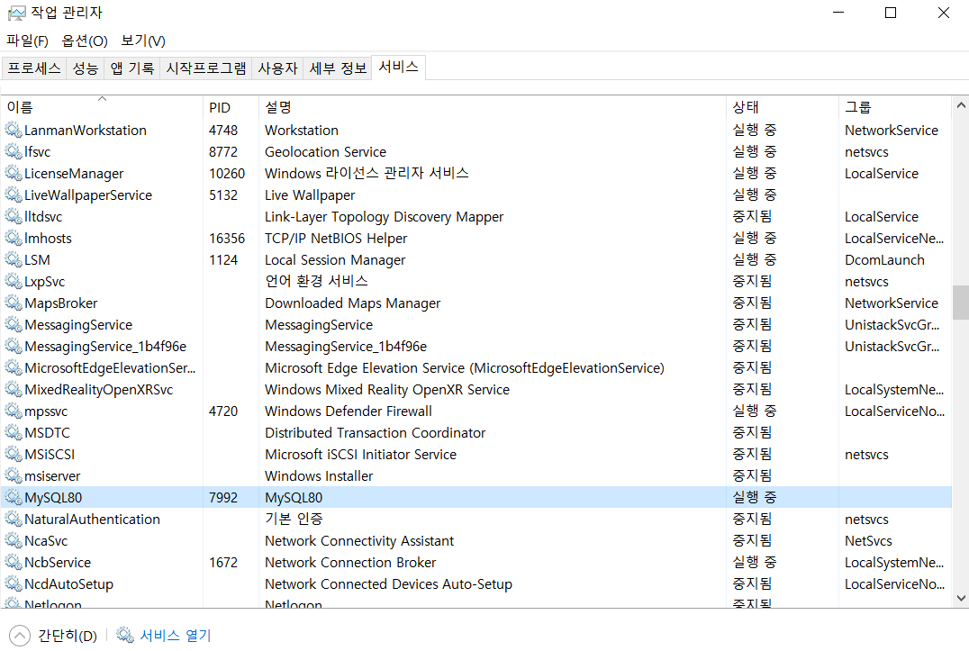 7. 작업관리자 -> MySQL80 -> 오른쪽 버튼 -> 다시 시작(처음에 중지, 다시 시작 누르면 됨)