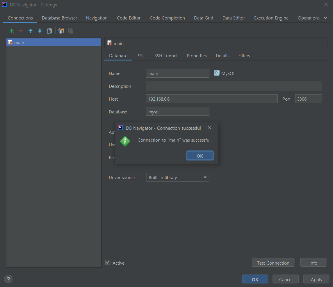 설정 입력 후 Test Connection 누르기 -> Conntection successful (연결 확인) -> OK