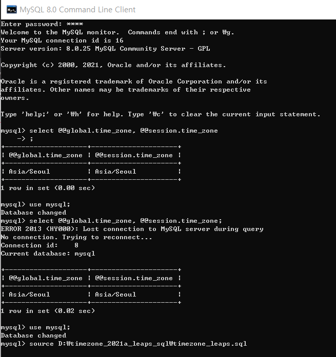(3) source D:\timezone_2021a_leaps_sql\tinezone_leaps.sql 입력(파일이 다운받아질 것)