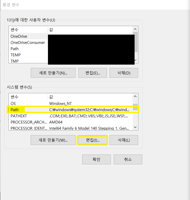 [해결책 2. '환경변수' - 시스템 변수(S) 내 Path 클릭 후 편집 들어가기]